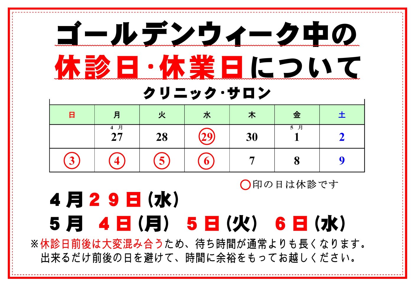 ![]() 4月27日(月)~5月9日(土)は連休の影響から混雑することが予想されます 予め、日付と時間に余裕もってご来院ください |
